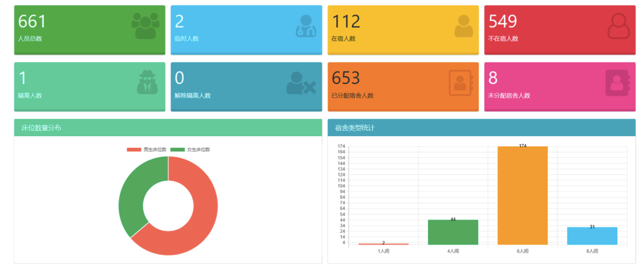 出入統(tǒng)計:出入人員的總覽,總人數(shù),在宿人數(shù),未在宿人數(shù),各樓層在宿人數(shù),未在宿人數(shù)。