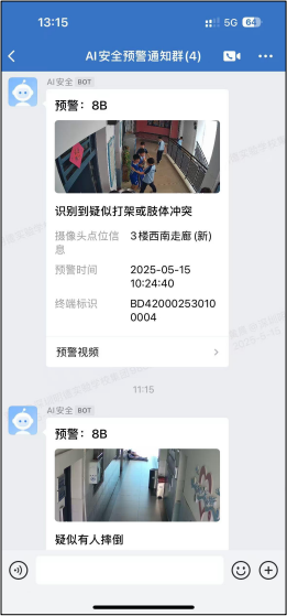 告警信息通過“平臺預警+企業微信群推送”等方式,毫秒級送達指定的安保、德育及管理人員,確保每一條關鍵信息都能被看見、被響應。